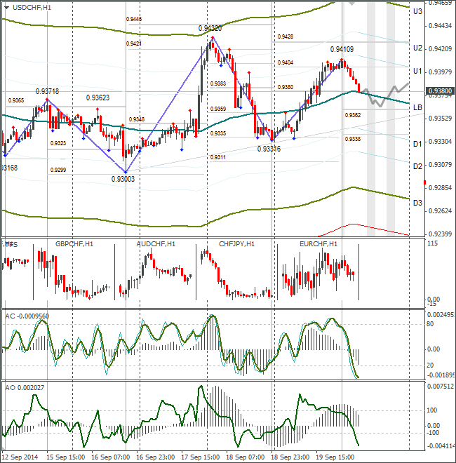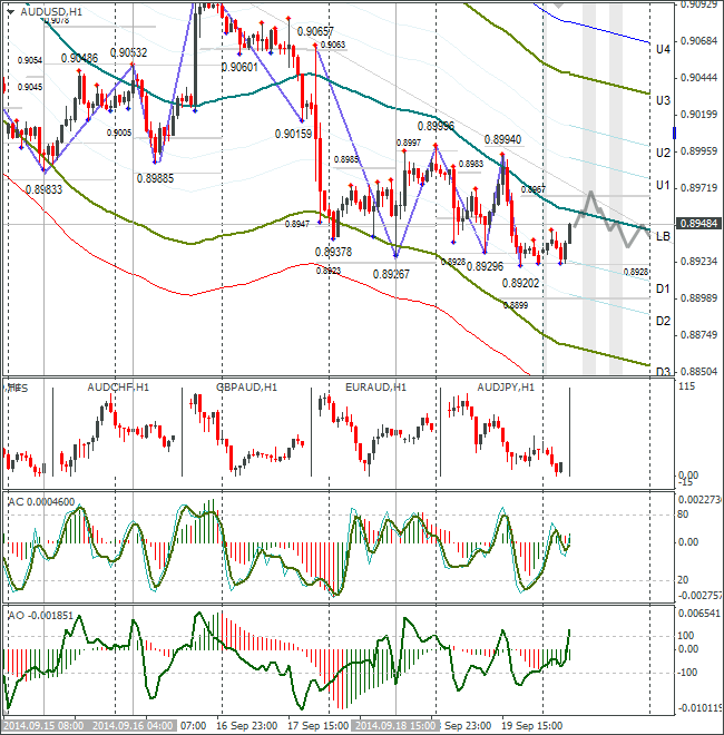 Здесь от 16 сентября формируется локальная структура для продолжения движения к изу. Продолжения нисходящей тенденции ожидаем после пробоя 0.8930, в данном случае цель – 0.8898, возле этого уровня консолидация цены. Проход ценой шумового коридора 0.8898 – 0.8874, должен сопровождаться развитием выраженного движения, здесь потенциальная цель – 0.8808, возле этого уровня консолидация. Краткосрочное восходящее движение возможно в коридоре 0.8989 – 0.9016, пробой последнего значения приведет к углубленной коррекции, здесь цель – 0.9052, этот уровень является ключевым сопротивлением для развития восходящей структуры, в данном случае потенциальная цель – 0.9115.