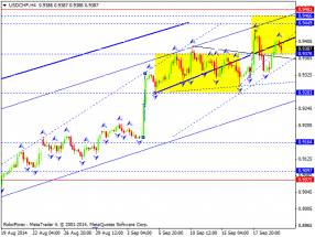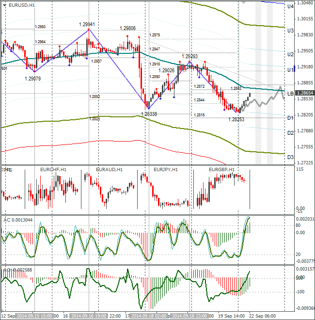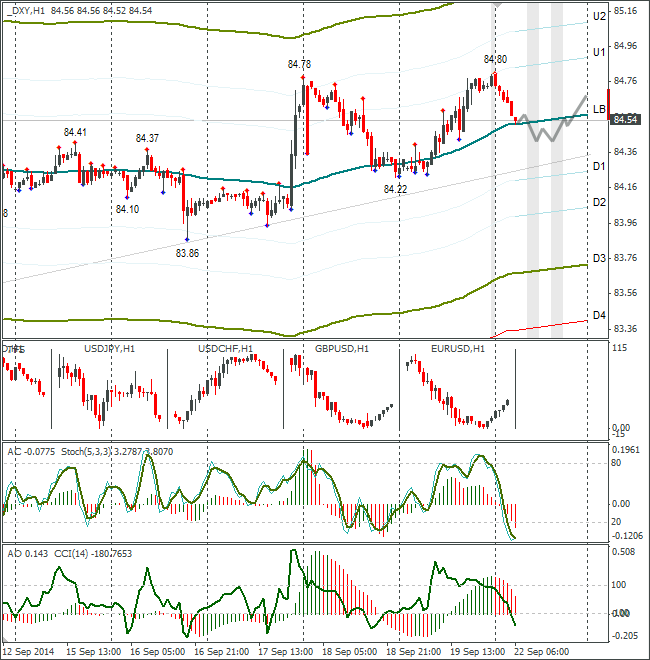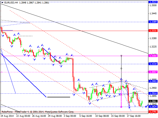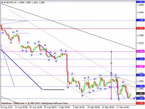 После публикации окончательных результатов референдума о независимости Шотландии, индекс доллара восстановился 84,80. Фунт по итогам дня упал на 237 пунктов, до 1,6286. «Медведи» отыграли все потери. Шотландия осталась в составе Соединнёного Королевства и больше не будет оказывать влияние на британский фунт. Инвесторы тут же вспомнили о недавнем снижении процентных ставок ЕЦБ, последнем заседании FOMC и слабых результатах аукциона TLTRO и перед выходными принялись выкупать американский доллар. Долларовые «быки» вернули себе контроль над ситуацией. Курс EUR/USD с максимума 1,2929 снизился на 104 пункта, до 1,2825.