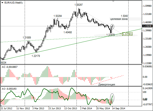 Торговые возможности по валютной паре: EUR/AUD пробил трендовую линию нисходящего движения, берущего своё начало с максимума 1,5829. Учитывая, что EUR/USD приближается к ключевой зоне поддержки 1,2780-1,2750, скорость падения евро к доллару может замедлиться и оказать положительное воздействие на единую валюту в паре EUR/AUD. В качестве первой мишени предлагаю рассмотреть повышение до отметки 1,4769. Торговая идея актуальна до конца декабря текущего года. Отменится при падении курса до 1,4045.