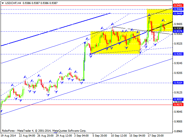 Валютная пара доллар франк торгуется в структуре расширения консолидации вверх. Не исключаем на сегодня попытки рынка обновить максимум. Далее - опять снижение к уровню 09376. Вся структура целиком также рассматривается как консолидация на вершине волны роста. И в любой момент рынок может отправиться на реализацию пробоя 0.9300 с фигурой продолжения снижения по тренду вниз. Первая цель внизу - 0.9070