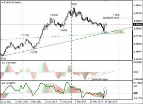 Чем же интересен данный кросс для торговли? Нисходящий тренд с максимума 1,5829 длится без серьёзных откатов 33 недели. Пробой трендовой линии есть сигнал к покупкам евро. Точный вход в длинную позицию нужно искать по часовому и 30-минутному тайм-фреймам. Потом, смотрите: на минувшей неделе курс EUR/USD опустился до уровня 1,2825. Зона сильной поддержки начинается с уровня 1,2780. Она образуется от минимумов 2012 и 2013 годов. После проведённого мной анализа пары EUR/USD я пришёл к выводу, что, скорее всего, евро пойдёт к 1,2780/50 нисходящим треугольником. Это значит, что темпы падения единой валюты будут снижаться и благоприятно скажутся на евро в паре EUR/AUD. После теста указанной зоны ожидается отскок в район 1,2990. При поступлении очередной порции негативной статистики из Китая рост EUR/AUD ускорится.