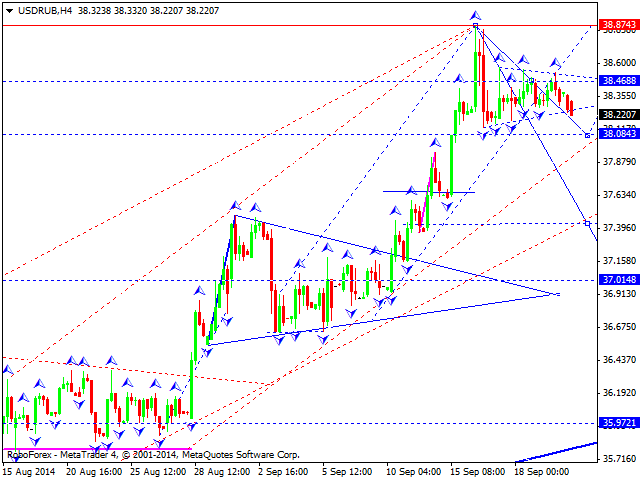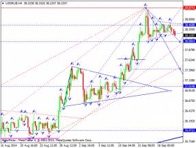 Российский рубль торгуется в структуре снижения на отработку уровня 38.08. На сегодня рассматриваем завершение консолидации в треугольнике и выход из него вниз с перекрытием цели. Далее рассмотрим возможность возврата на тест снизу уровня 38.50. Далее - снижение к уровню 37.00.