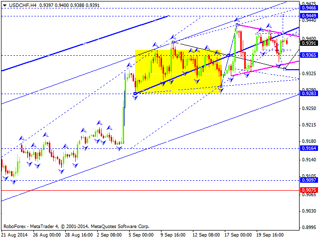 Валютная пара доллар франк продолжает торговаться в консолидационной структуре у вершины волны роста без ярко выраженной тенденции. На сегодня рассматриваем возможность снижения к уровню 0.9340. Далее рассмотрим возможность ещё одной структуры роста на перекрытие уровня 0.9450. На этом волна роста исчерпает свой потенциал. Затем будем рассматривать развитие разворотной структуры на предмет продолжения развития волны снижения.
