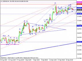 Российский рубль предпринял попытку сформировать очередную фигуру продолжения роста. Но с пробоем вниз будем рассматривать на сегодня снижение на отработку уровня 38.08. Далее рассмотрим возврат к уровню 38.50. Затем рассмотрим возможность развития очередной волны снижения на перекрытие уровня 37.00.