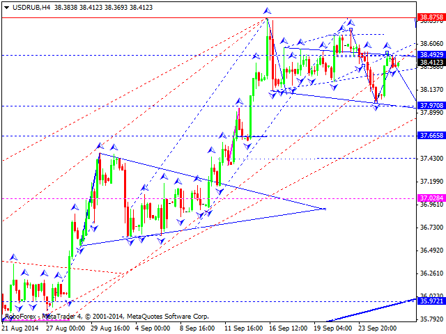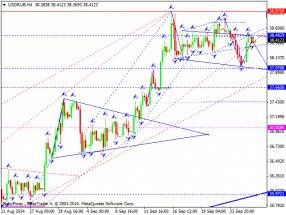 Российский рубль отработал коррекцию На сегодня основным сценарием рассматриваем возможность развития очередного снижения на пробой минимума первой волны. На уровне 37.95 ожидается формирование консолидации с фигурой продолжения снижения. Цель второй волны снижения - на уровне 37.50. Далее - возврат на тест снизу 37.95.