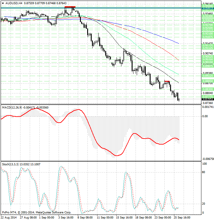 Курс валюты по-прежнему расположен существенно ниже скользящих средних с периодами 34, 55, 89 и 144, которые направлены вниз и указывают на сохраняющиеся медвежьи настроения (в среднесрочной перспективе), а также являются рядом уровней сопротивления 0.88725, 0.8930, 0.90275 и 0.91425.