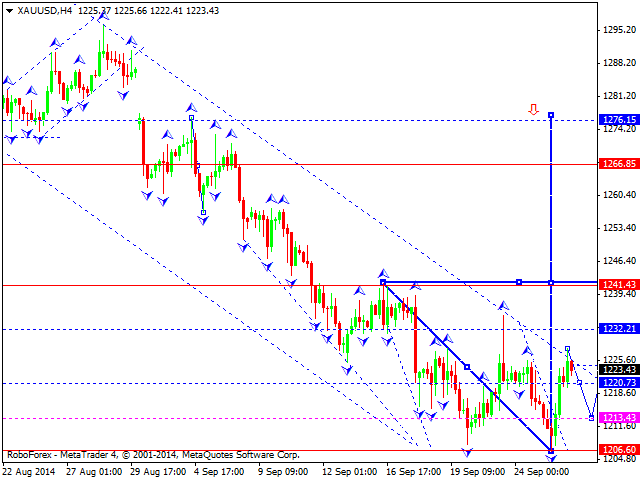 Золото исполнило очередной импульс роста. Сегодня на очереди - коррекция к уровню 1214. Далее рассмотрим возможность развития второго импульса роста. Цель - на уровне 1240.Далее - снижение на тест сверху 1220.