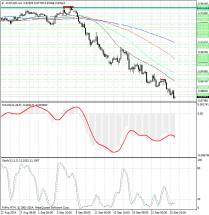 Гистограмма MACD по-прежнему расположена в отрицательной зоне и ниже своей сигнальной линии, продолжает плавно снижаться и тем самым подает сигнал на продажу австралийского доллара (AUD).