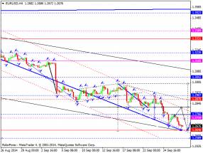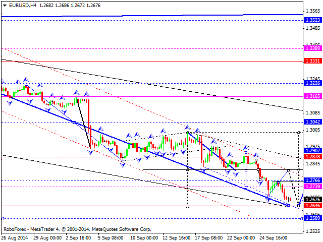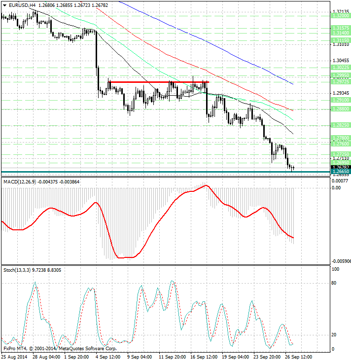 Изменений настроений на рынке мы не наблюдаем, пара EUR/USD продолжает стремительное снижение, пробивая новые уровни фрактального старта. Очередной фрактал на отметке 1.2696 был пробит. Однако в результате достаточно быстрого ослабления пары фракталы на повышение не отображаются. Это говорит о том, что смена настроений произойдёт лишь в том случае есть покупателям удастся вернуться выше уровня фрактального старта 1.2903.