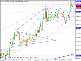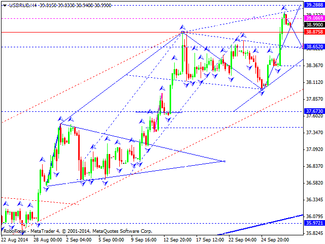 Российский рубль расширил консолидацию вверх. Рассматриваем возможность перекрытия уровне 39.20. Далее рассмотрим возможность развития новой консолидации с формированием разворотной модели. На очереди - коррекция к уровню 34.00.