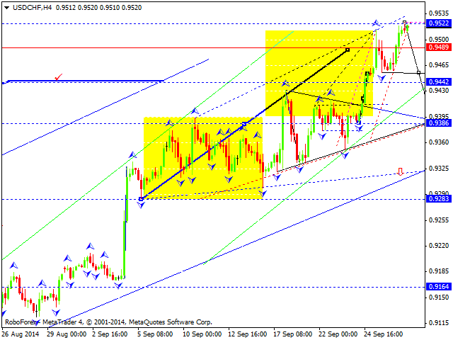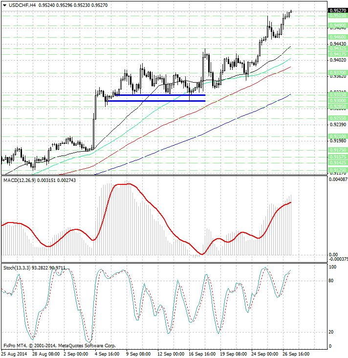 Курс валюты по-прежнему расположен существенно выше скользящих средних с периодами 34, 55, 89 и 144, которые направлены вверх и указывают на сохраняющиеся бычьи настроения (в среднесрочной перспективе), а также являются рядом уровней поддержки 0.9440, 0.94075, 0.9385 и 0.93175.