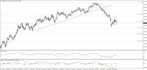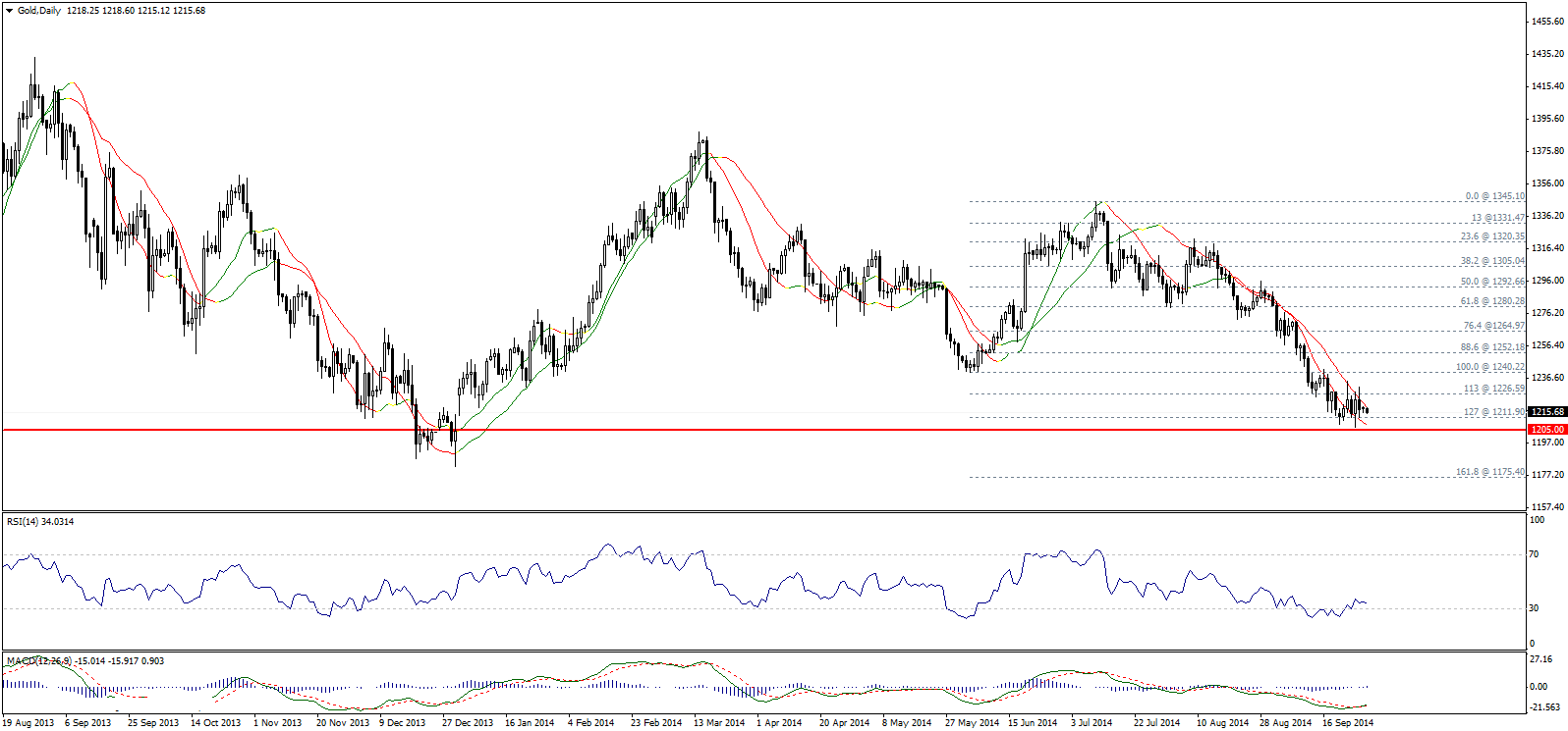 Золото немного сместилось вниз, но по прежнему торгуется выше уровня поддержки 1211,90 (127,2% коррекции Фибоначчи), а так же выше уровня поддержки 1205,00. Стабильность выше данных уровней ослабляет медвежий сценарий, но в целом он по прежнему в силе, особенно при условии торговли ниже уровня 1240,22, а так же линий Линейной регрессии показывающих негативную динамику. Следует отметить, что MACD и RSI находятся в области перепроданности, но пока торги идут ниже уровня 1226,60 мы предпочитаем игнорировать эти сигналы.