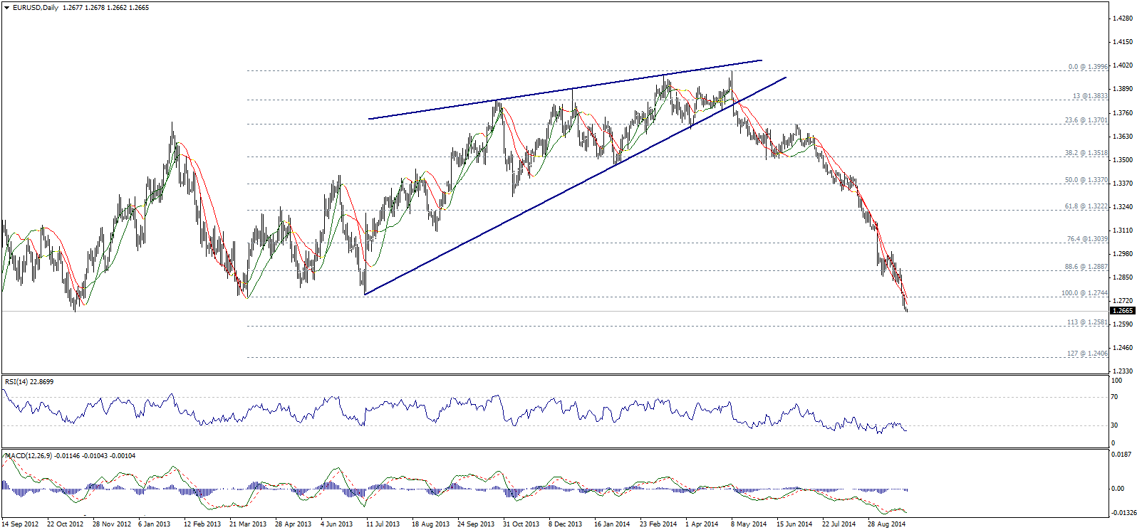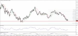 Пара пробила предыдущий минимум 1,2744 и стабилизировалась под ним, что указывает на возможность дальнейшего снижения с целью 113% коррекции Фибоначчи (1,2580), прорыв которого, в свою очередь, отправит пару к области 1,2405. Линии Линейной регрессии отрицательны, но RSI находится в области перепроданности, что может привести к небольшому откату перед началом снижения.