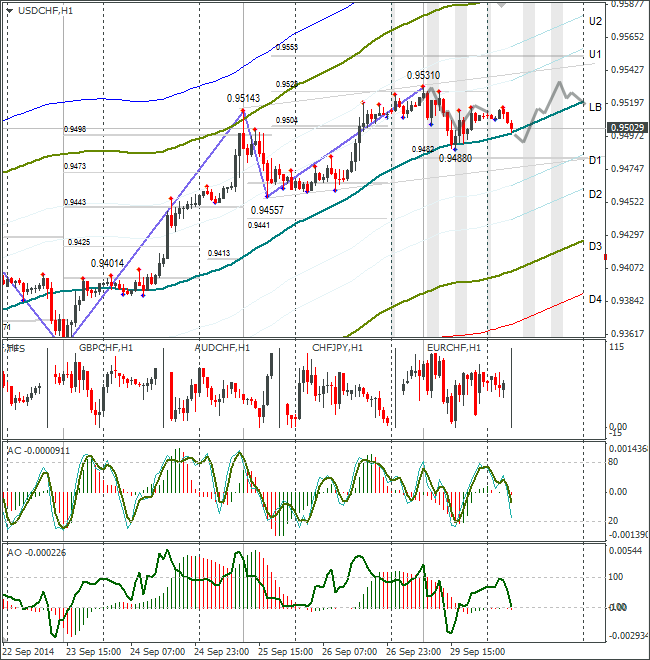 Курс USD/CHF скорректировался до линии lb. Пара торгуется по 0,9507. По основному сценарию жду роста. Считаю, что часовые индикаторы разгрузились, можно разворачиваться вверх. На разворот уйдёт около трёх часов. Как только курс USD/CHF обновит максимум, лучше закрыть внутридневные длинные позиции. На четверг и пятницу запланированы важные данные. Участники могут просто начать фиксировать прибыль.
