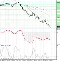 Гистограмма MACD по-прежнему расположена в отрицательной зоне и ниже своей сигнальной линии, продолжает плавно снижаться и тем самым подает сигнал на продажу австралийского доллара (AUD).