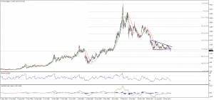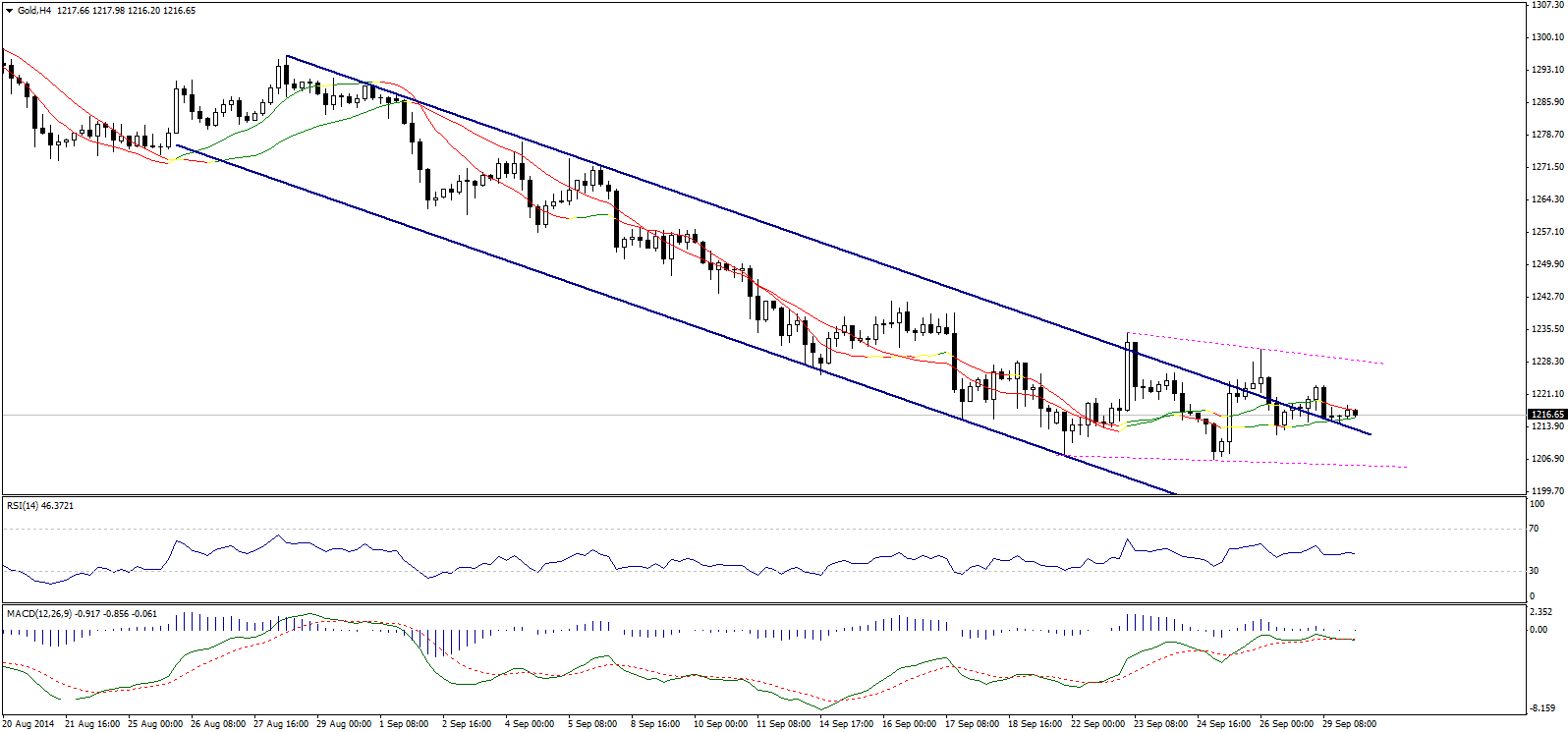 На четырехчасовом графике Вы можете заметить, что металл торгуется выше уровня сопротивления нисходящего канала, но в то же время ниже уровня сопротивления 1226,60. Учитывая торговлю в боковом диапазоне (1211,90 - 1226,60), мы предпочитаем оставаться вне рынка.