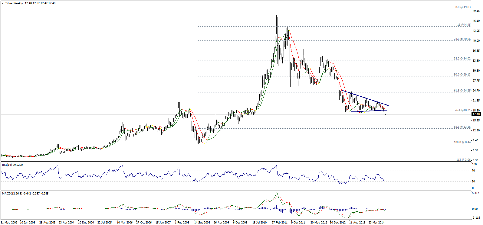 Серебро торгуется в узком диапазоне ниже уровня 18,21 (76,4% коррекции Фибоначчи) и ниже ранее пройденного уровня поддержки фигуры "Треугольник", что сохраняет наши ожидания относительно пробоя уровня 17,24 в силе.