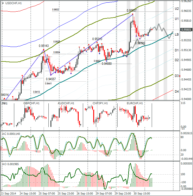 Здесь краткосрочное восходящее движение ожидаем в коридоре 0.9596 – 0.9619, пробой последнего значения позволит рассчитывать на движение к потенциальной цели – 0.9650, по достижении которого ожидаем откат в коррекцию. Краткосрочное нисходящее движение возможно в коридоре 0.9535 – 0.9515, пробой последнего значения приведет к углубленной коррекции, здесь цель – 0.9482, этот уровень является ключевым сопротивлением для развития нисходящей структуры.