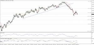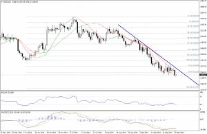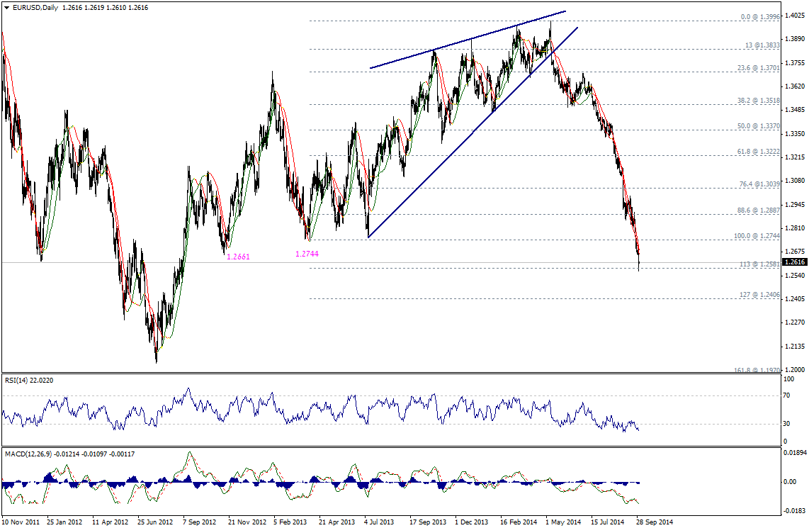 Вчера пара коснулась уровня поддержки 1,2580 (113% коррекции Фибоначчи), после чего немного отскочила. Тем не менее, отскок не был достаточно сильным, чтобы изменить наши негативные ожидания и мы по прежнему ждем ее дальнейшего снижения.
