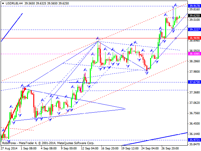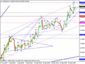 Российский рубль пробил консолидацию вверх и почти перекрыл цель. На сегодня рассматриваем возможность ещё одной структуры роста на обновление максимума. Далее будем рассматривать развитие структуры снижения. На данной вершине ожидаем формирование консолидации с разворотной структурой. На очереди - развитие серьёзной коррекции к уровню 34.00.