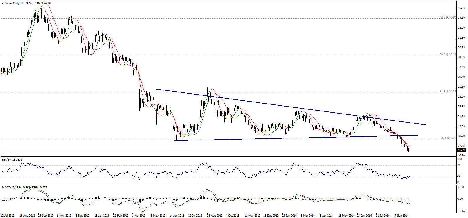 В прошлу пятницу Серебро снизилось под уровень поддержки 17,00, самого низкого с с марта 2010 года. RSI находится в области перепроданности, но торговля ниже уровня 18,22 и отрицательные линии Линейной регрессии заставляют нас придерживаться медвежьего сценария.
