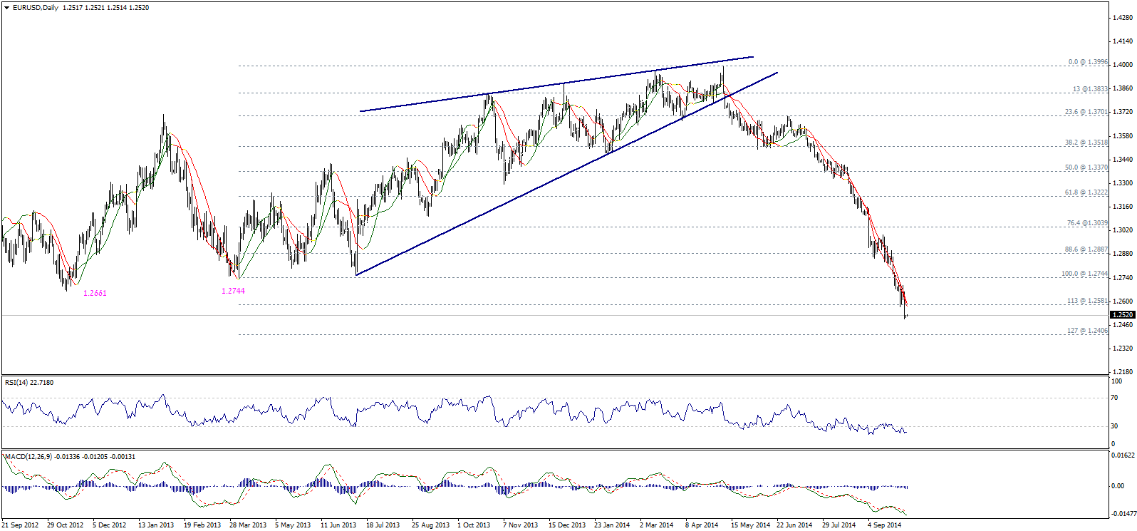 На прошлой неделе пара пробила уровень 113% коррекции Фибоначчи (1,2580), что способствует дальнейшему расширению нисходящего движения с целью 1,2405 (127,2% коррекции). RSI находится в области перепроданности, но пока торги идут ниже уровня 1,2580 и ниже линий Линейной регрессии, мы будем придерживаться медвежьего сценария.