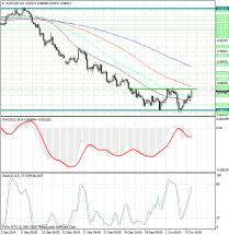 Гистограмма MACD по-прежнему расположена в отрицательной зоне, но выше своей сигнальной линии, продолжает плавно повышаться и тем самым подает сигнал на покупку австралийского доллара (AUD).