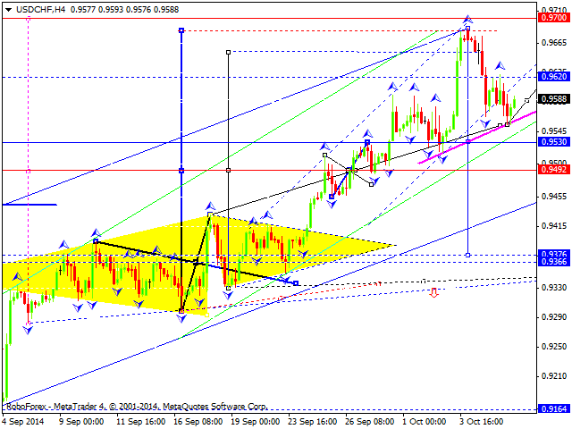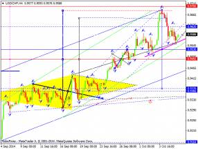 Здесь, мы продолжаем следить за формированием потенциала для низа от 3 октября. Продолжения движения к низу, ожидаем после пробоя 0.9571, в данном случае цель – 0.9546, возле этого уровня консолидация цены. Проход ценой шумового коридора 0.9546 – 0.9529 должен сопровождаться развитием направленного движения, здесь цель – 0.9483, возле этого уровня консолидация цены. Краткосрочное восходящее движение, возможно в коридоре 0.9629 – 0.9650, пробой последнего значения будет располагать к развитию нисходящей структуры, в данном случае цель – 0.9688. Основная тенденция – формирование потенциала для нисходящего движения от 3 октября.