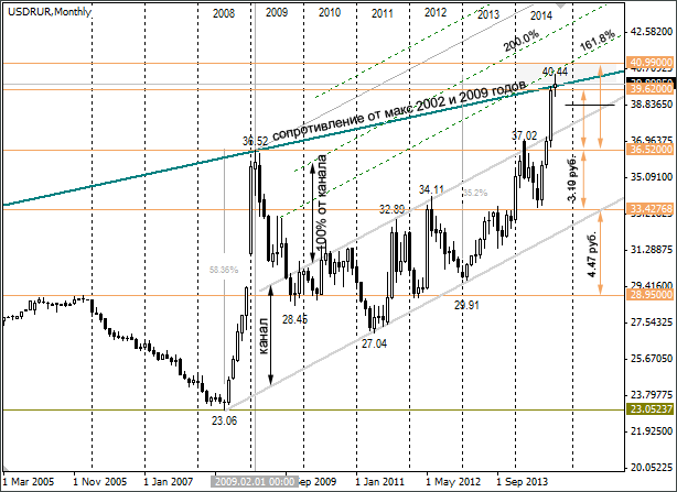 Есть ещё один технический фактор, который может отправить рубль в краткосрочный рост. Рост в 2008 году с 23,06 до 36,52 составил 13,46 рублей. От минимума 27,04 (минимум 2011 года) до 40,44 (максимум 2014 года) – составляет 13,40. Волны практически равны, что наводит на мысль – коррекция назрела. В качестве первой целевой зоны можно взять уровни 38,83/38,65. Возвращение курса обратно в канал, откроет дорогу к 38,08 и затем к 36,52.