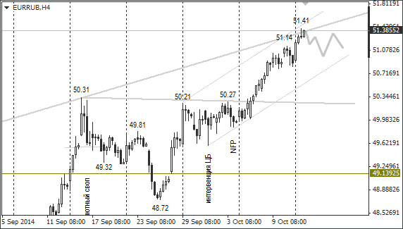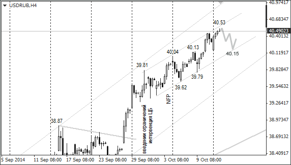 Доллар/рубль с 30 сентября формирует на четырёхчасовом графике пилообразную модель диапазоном в 55 копеек. Модель «медвежья», но долларовым покупателям удаётся удерживать высокий курс из-за отсутствия фундаментальных факторов к росту рубля.