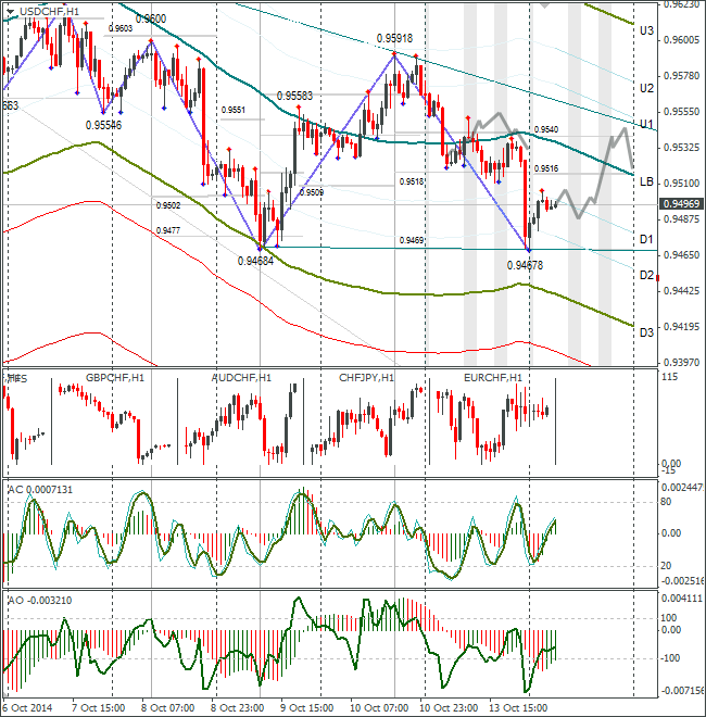 Курс USD/CHF провёл торги в Европе и США около линии lb, и к закрытию дня на тонком рынке совершил прорыв к 0,9467. Получилось зеркальное отражение к паре евро/доллар. Что дальше? По евро формируется треугольник. По франку может сформироваться двойное дно, или нисходящий треугольник. Торопить события не стоит. По прогнозу рассмотрю на вторник рост USD/CHF до трендовой линии – 0,9545.