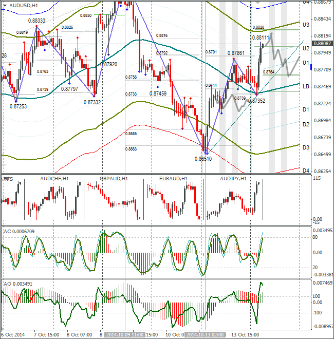 Курс AUD/USD после роста к 0,8786 вернулся к балансовой линии. С утренним ростом не успел разобраться. Так как пара находится к линии U3, то по основному сценарию рассматриваю возвращение AUDUSD к поддержке 0,8764. Если австралиец будет быстро терять очки, тогда жду его падение до линии lb – 0,8745.