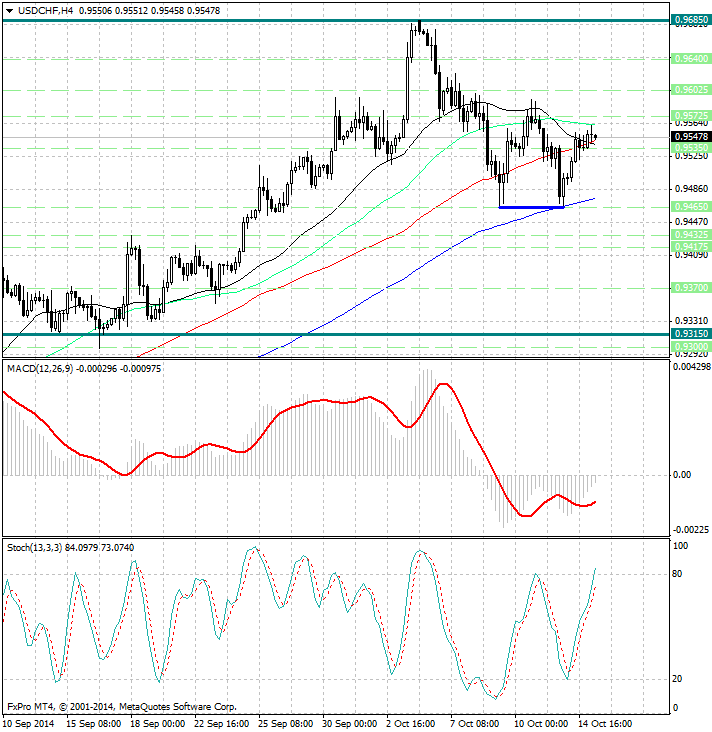 Курс валюты зажат между скользящей средней с периодом 55 (уровень сопротивления 0.9565) с одной стороны и средних с периодами 89, 34 и 144 (уровни поддержки 0.9545/40 и 0.9475) с другой.