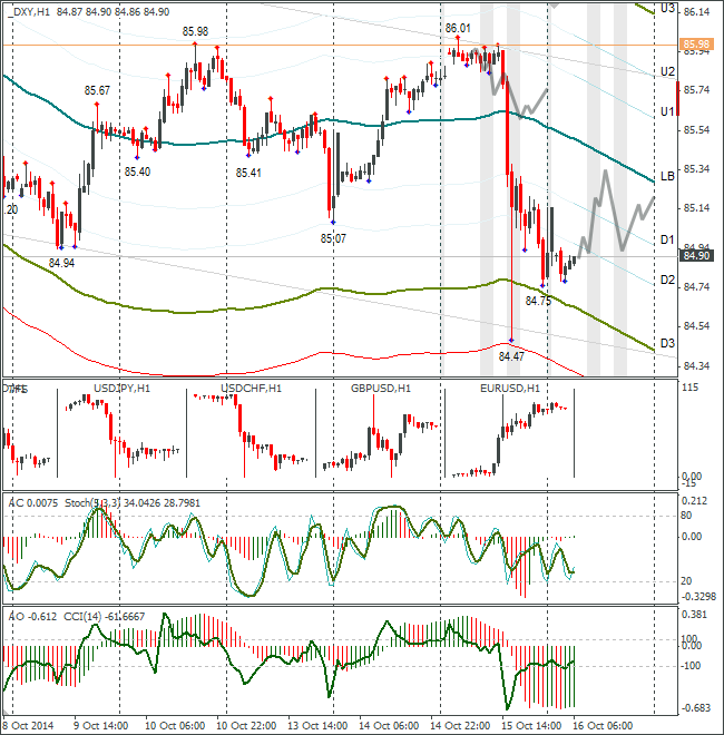 Индекс доллара упал до 84,47 и затем восстановился до 84,90. Вчерашнее падение в такой амплитуде было нежелательно. Сейчас рынок будет искать точку баланса. Я считаю, что чем быстрее доллар вернётся к линии lb, тем будет лучше для него, так как на рынок вернуться покупатели, которые с откатов начнут подбирать доллар. Закрытие DXY ожидаю в районе lb на уровне 85,20/35.