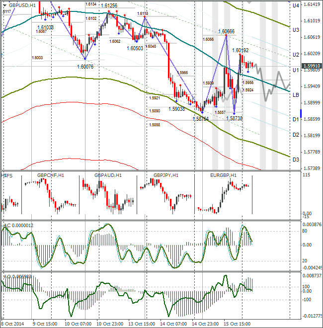 Курс валюты по-прежнему расположен значительно ниже скользящих средних с периодами 34, 55, 89 и 144, которые направлены вниз и указывают на сохраняющиеся медвежьи настроения (в среднесрочной перспективе), а также являются рядом уровней сопротивления 1.60675, 1.6140 и 1.6205.