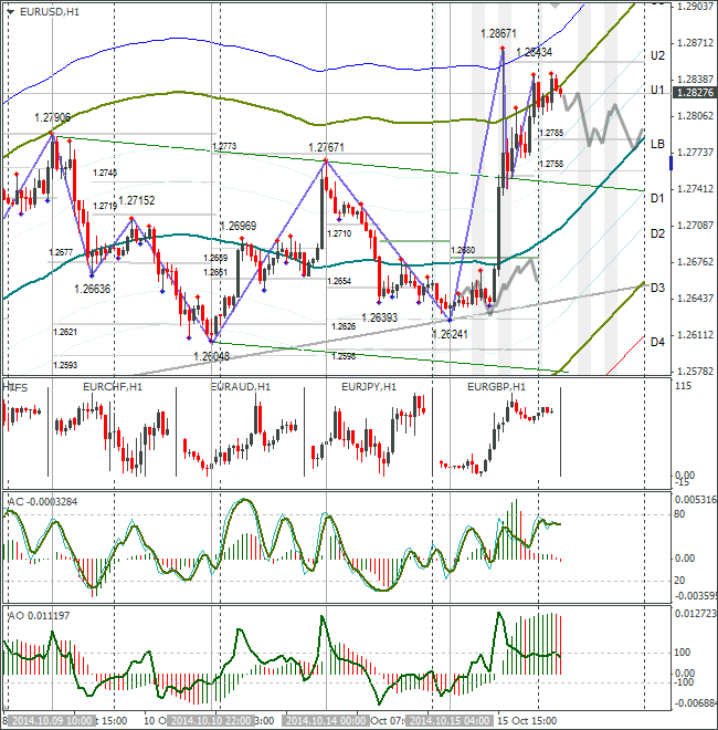 После выхода американской статистики курс евро/доллар повышался до линии U4. Пара быстро вышла из зоны зашкала и в настоящее время зацепилась за линию U3. Я по основному сценарию жду возвращение EURUSD к линии lb. Чтобы нивелировать вчерашнее ралли евро, необходимо понизить курс до 1.2712. На сегодня допускаю падение евро до 1,2750, но ниже вряд ли. Хотя, кто его знает. Тренд медвежий, а по тренду доллар может быстро отыграть все потери. Остановлюсь пока на падении до 1,2770/75.