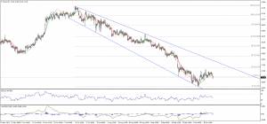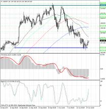 Гистограмма MACD расположена в отрицательной зоне и немного ниже своей сигнальной линии, но начала плавно повышаться и тем самым указывает на возможное усиление бычьих настроений.