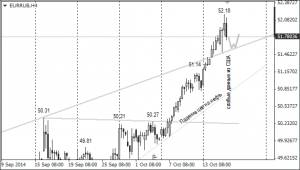 На фоне падения доллара США и роста пары евро/доллар курс евро/рубль достиг нового исторического максимума 52,18 и к закрытию торгов вернулся к отметке 51,78. Появились первые признаки начала коррекции. Чтобы паре доллар/рубль продолжить коррекционное движение до 40,10, необходимо пройти уровень 40,40. Пройти его будет непросто, поскольку Brent продолжает обновлять минимумы и по последним котировкам торгуется по 83,25 долларов за баррель. При снижающейся нефти доллар/рубль может на время зависнуть над уровнем 40,40. Этот уровень являлся сильным сопротивлением, которое с 13 октября стало поддержкой.