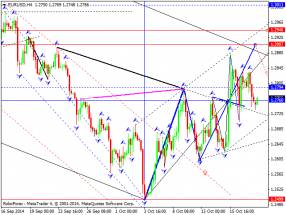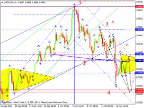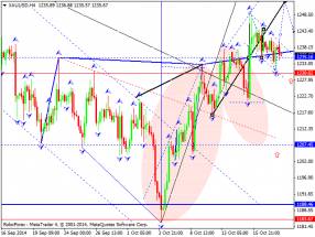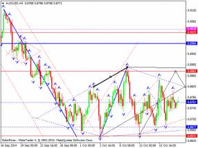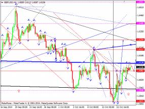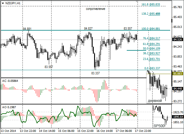 Дневные свечи с длинными тенями и дивергенция на дневном CCI делает график привлекательным для рассмотрения покупок. На срезе видно, что цель для NZD как минимум до 85,83/88. На часовом графике я сделал разметку, чтобы обосновать целевую зону. Смотрите, всё просто. На горизонтальный канал натягиваю сетку фибо. Минимальный ход после пробоя составляет 161,8% от канала. В данной ситуации 161,8 = 85,83. На этом же уровне находится горизонтальный уровень сопротивления от максимумов 1, 2 и 9 октября. Идея краткосрочная, по прогнозу Альпари она будет актуальна в течение 3-4 дней. Она отменится при закрытии дневной свечи ниже 83,92.
