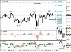 На опасениях замедления роста мировой экономики распродажа американских акций вызвала бегство от рисков. Несколько дней курс NZD/JPY торговался в боковом тренде. Индекс S&P500 в среду отскочил от минимума 1820,66 к 1890,44 и сейчас пара NZDJPY готовится пробивать зону сопротивления 84,82-84,88. В правом нижнем углу приведены два среза с дневных графиков: NZDJPY и S&P500.