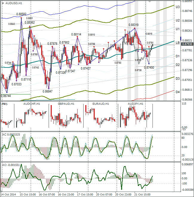 Существенных изменений в технической картине пары аусси/доллар США не происходит: пара продолжает торги в пределах отмеченного ранее боковика 0.8650–0.8900. С открытием торгов в понедельник, диапазон торгов сузился до 100 пунктов, это может указывать на завершение фазы консолидации. Тем не менее всё ещё сложно определить дальнейшее направление движения, вплоть до момента выхода котировок за пределы бокового канала.
