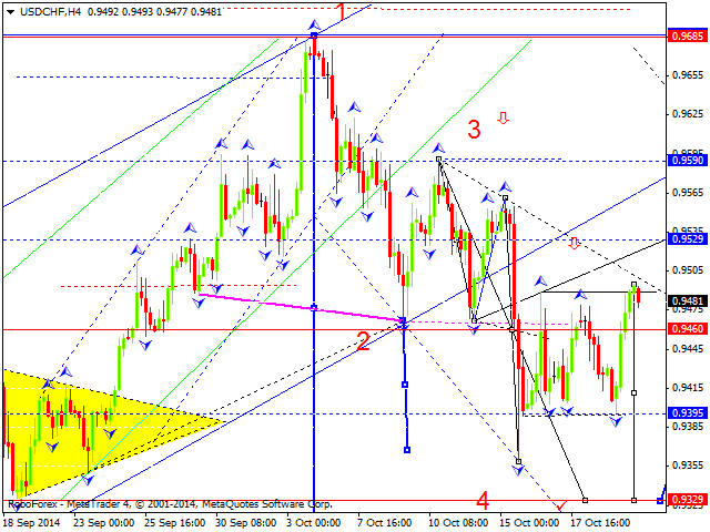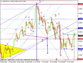 Здесь мы продолжаем следить за развитием нисходящей структуры от 3 октября, в целом цена близка к отмене развития нисходящей структуры, что должно произойти после пробоя 0.9505. Краткосрочное нисходящее движение ожидаем в коридоре 0.9418 – 0.9382, пробой последнего значения должен сопровождаться развитием выраженного движения, здесь цель – 0.9334. Потенциальным значением для низа считаем уровень 0.9308, по достижении которого ожидаем консолидацию. Уровень 0.9503 является ключевым сопротивлением для формирования восходящей структуры, его проход ценой позволит рассчитывать на движение к уровню 0.9571. Основная тенденция – развитие нисходящей структуры от 3 октября, стадия глубокой коррекции.