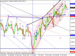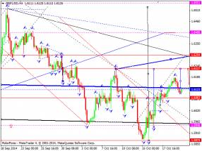 Здесь мы продолжаем следить за формированием восходящей структуры от 15 октября. Продолжения движения кверху ожидаем после пробоя 1.6177, в данном случае цель – 1.6223, возле этого уровня консолидация цены. Потенциальным значением для верха считаем уровень 1.6281, по достижении которого ожидаем откат в коррекцию. Краткосрочное нисходящее движение возможно в коридоре 1.6130 – 1.6104, пробой последнего значения приведет к развитию углубленной коррекции, здесь цель – 1.6053. Основная тенденция – формирование потенциала для верха от 15 октября, стадия коррекции.