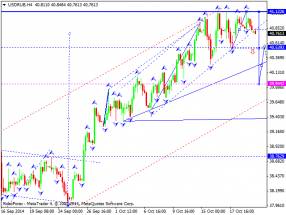 Российский рубль вышел вниз из канала последней структуры роста. На вершине волны сформирован консолидационный диапазон и пробит вниз. На сегодня рассмотрим возможность отработки уровня 40.53. Далее ожидаем развитие консолидации и пробой вниз на отработку уровня 39.94.