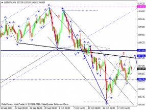 Здесь мы продолжаем следить за формированием восходящей структуры от 16 октября. Краткосрочное движение кверху, ожидаем в коридоре 107.47 – 107.84, пробой последнего значения должен сопровождаться развитием направленного движения, в данном случае цель – 108.56. Краткосрочное нисходящее движение, возможно в коридоре 106.66 – 106.41, пробой последнего значения приведет к углубленному движению, здесь цель – 106.12, от этого уровня ожидаем ключевой разворот к верху, его проход ценой будет располагать к развитию нисходящей структуры, в данном случае потенциальная цель – 105.49. Основная тенденция – формирование потенциала для верха от 16 октября, стадия коррекции.