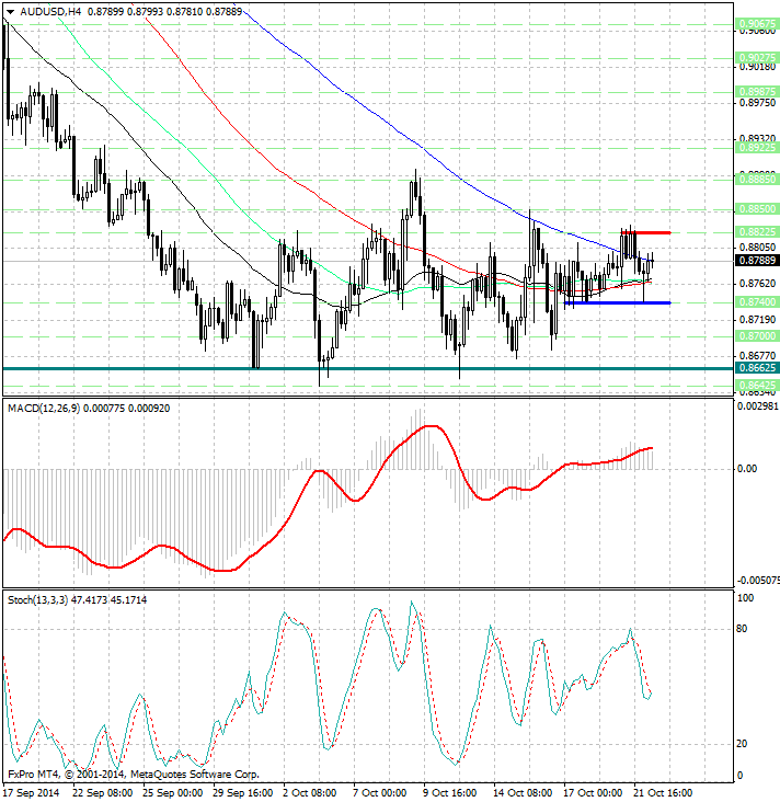 с одной стороны курс валюты встречает существенное сопротивление возле уровня 0.88225, с другой - находит ощутимую поддержку возле уровня 0.8740...