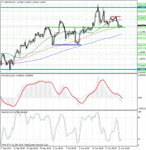 Курс валюты расположен немного выше скользящих средних с периодами 34, 55 и 89, которые являются практически единым уровнем поддержки 0.8770/65 и в данный момент слился со средней с периодом 144.