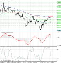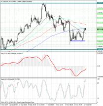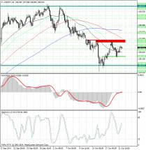 Курс валюты зажат между скользящих средних с периодами 55 и 34 (уровни сопротивления 1.2735 и 1.27625) с одной стороны и средней с периодом 89 (уровень поддержки 1.26925) с другой, и в данный момент пытается закрепиться выше средней с периодом 144.