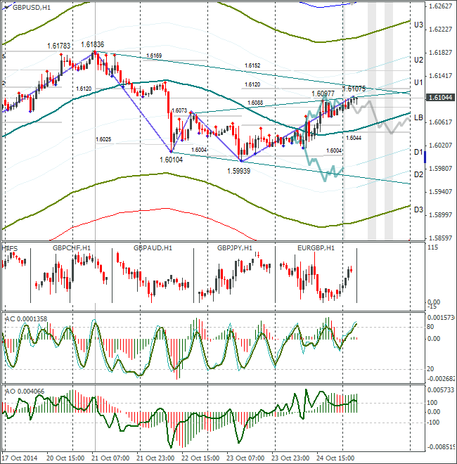 В пятницу на торгах в Европе GBP/USD пытался развить восходящий импульс и после неудачной попытки пройти 1,6070 вернулся к 1,6030. Фунт отреагировал ростом на 40 пунктов на предварительные данные ВВП Британии за III квартал. Британец возобновил рост на американской сессии и стабилизировался на уровне 1,6085. Вместо ожидаемого снижения курс GBP/USD вырос. Основной сценарий отработался зеркально. На днях реализовывается разворотная модель, поэтому на время нужно отказаться от продаж фунта. Так как в пятницу курс GBP/USD закрылся ростом, в понедельник по нему рассматриваю снижение до 1,6040. Хоть доллар открылся снижением, прогноз менять не стал.