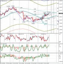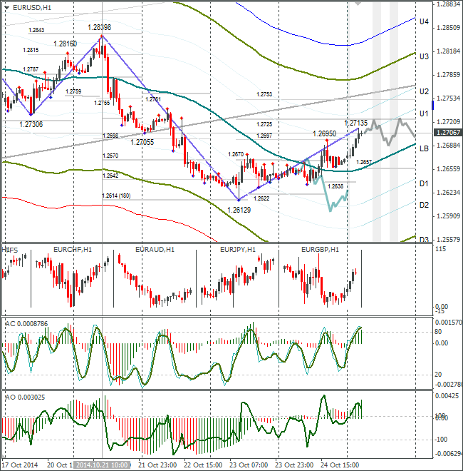 Вчера до обнародования отчёта ЕЦБ я ожидал, что евро с открытия рынка потихоньку пойдёт вниз. Ошибся, евро приподнялся на 35 пунктов, до 1,2713. Учитывая, что в пятницу евро закрылся ростом, и в Азии он продолжился, на понедельник по-прежнему склонен к возвращению курса к линии lb. Вчерашний прогноз пришлось изменить на М-образную модель.